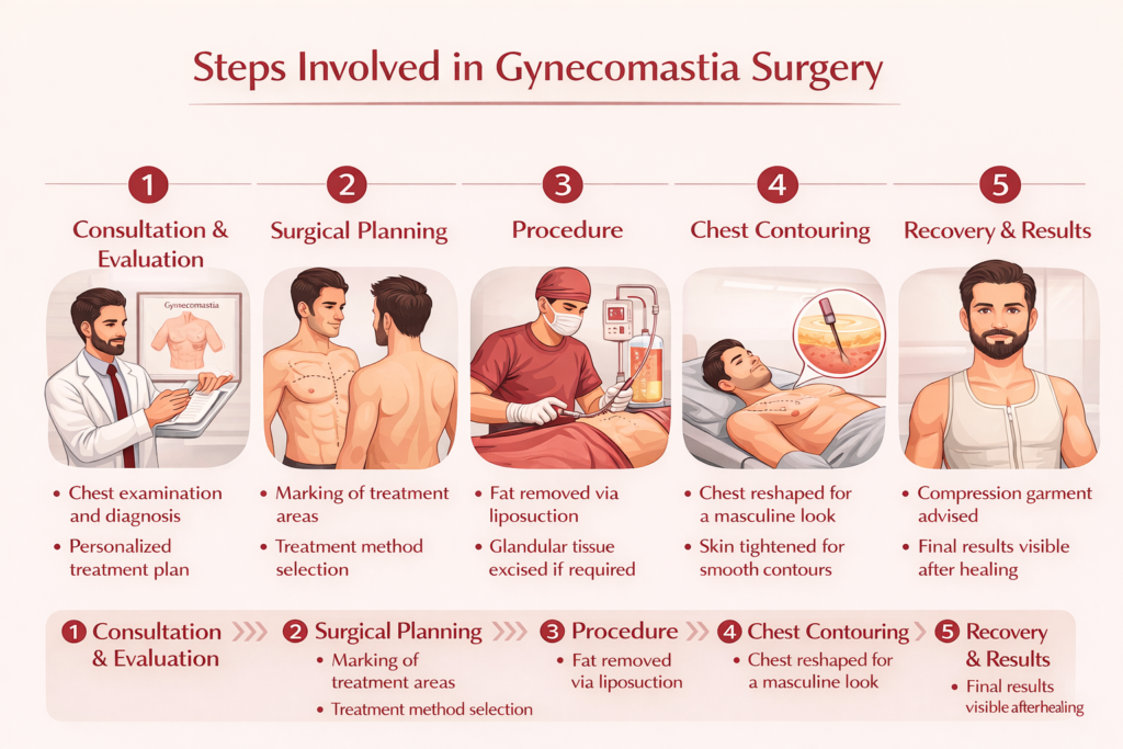 The surgery helps remove excess fat and gland tissue from the chest to create a flat, firm, and natural-looking male chest. Depending on the condition, the procedure may involve liposuction, gland removal, or a combination of both. The technique used is selected after proper medical evaluation.